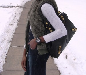 I was looking through my closet the other day and I just realized that I have a lot of fur throughout my wardrobe than I thought from vests, to coats, and other trimmed items-which shouldn’t be a surprise since i h|a|t|e being cold! I bought this fur vest in a vintage store in Toronto a few years ago and its held up pretty well. Its nice because its reversible with quilted lining on the inside. I pair it with everything but today I decided to pair it with a high-waist skirt and thermal. I love practical fashion!