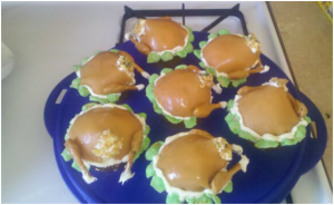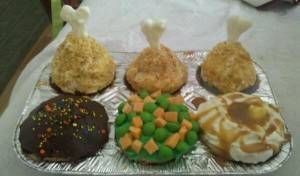 I almost didn’t want to give away her secret of how she made it, but she willing told me her super secrets to creating this “meal.” This is what she told me: “…I picked these meals because its kind of a joke because its not dinner-its dessert. The original cupcakes were vanilla without any additional flavors. The chicken bone is made out of white chocolate, the peas and carrots are crafted out of green skittles and orange Starburst, and the gravy that is oozing from the mash potatoes is caramel sauce on white frosting. And of course, let’s not forget about the ‘fried chicken’ which was sprinkled with corn flakes for a battered chicken appearance.”